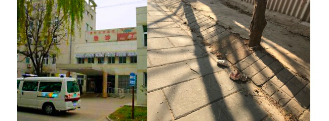 左:清华大学校医院、右:老人摔倒现场及擦拭血迹的纸巾