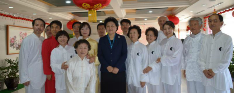 2014年元宵节,时任国务院副总理刘延东到驻韩国首尔文化中心参观,与门敢红(二排左四)太极拳学员合影