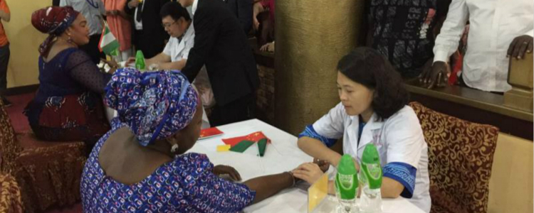 2016年,赵宏(右)参加国务院侨办组织的“中医关怀行”活动,在尼日利亚为当地人和华侨义诊