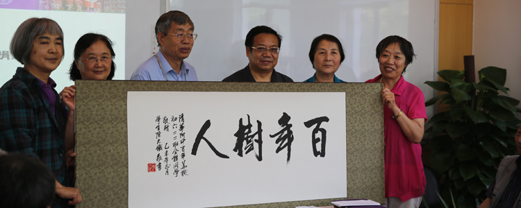 初622班校友代表贾天珍、王纪华、郭小泉等为母校捐赠了“百年树人”书法作品,贾天珍说,百年来,皇冠体育官网培养了一批批精英,更有很多向吴承露老师这样踏踏实实教书育人的老师,影响了附中学子,今天借吴承露老师的追思会,他们将书法作品捐赠给母校,祝愿学校百年华诞,再创辉煌。