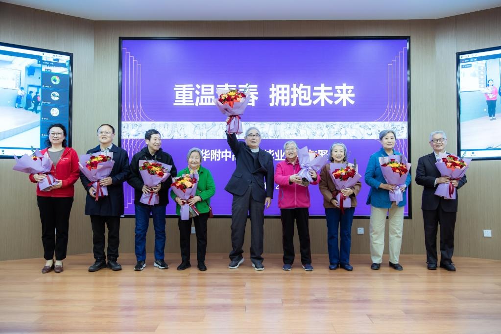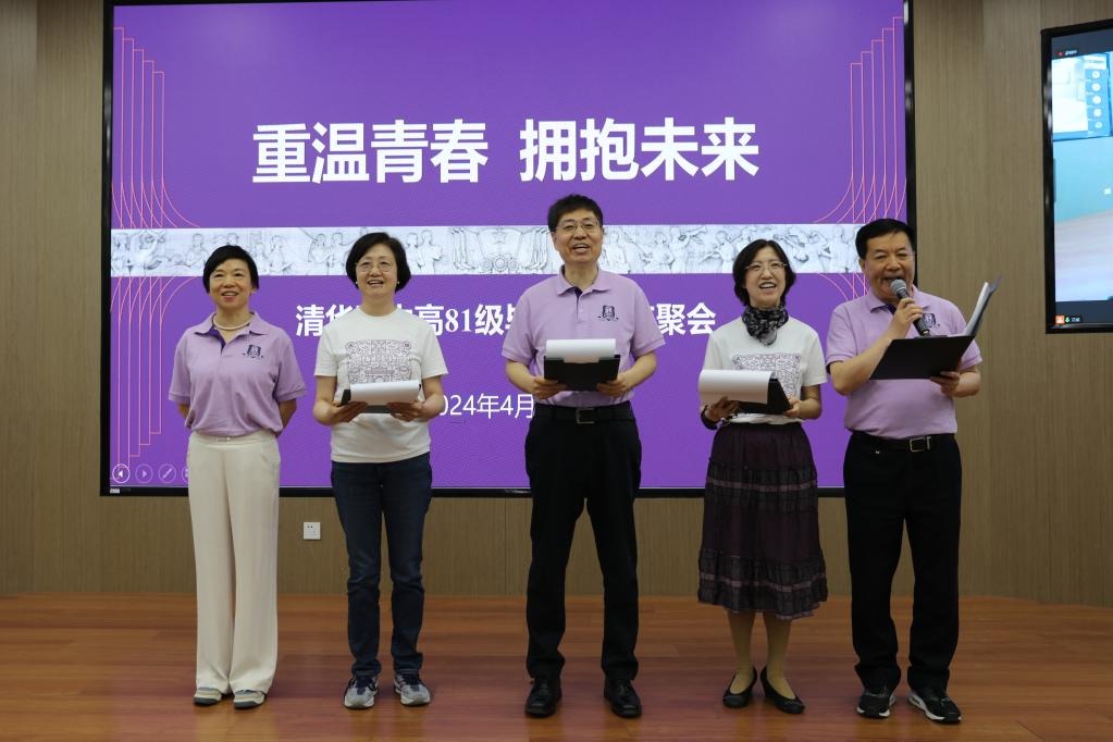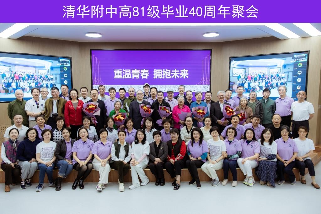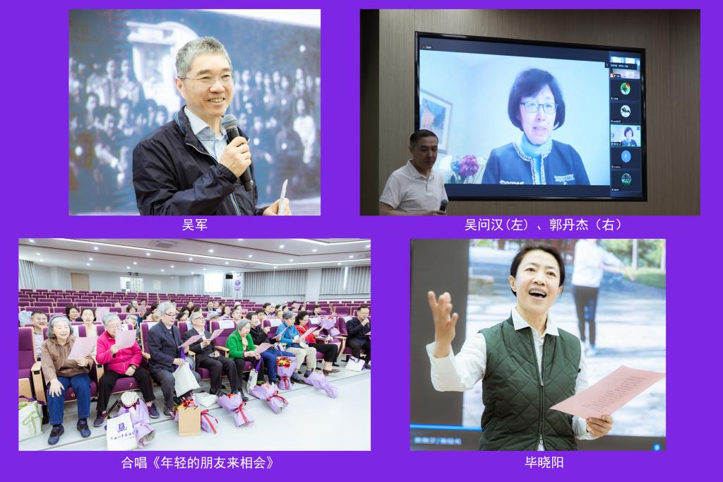 吴问汉校友邀请远在海外的郭丹杰通过腾讯会议远程分享了她对健康的独特见解及保健知识,强调了健康的重要性。随后,吴军校友分享了近几年对工作生活的体会,对附中教育理念的理解和科技前沿发展的脉络,并向母校赠送了最新出版的图书《脉络——小我与大势》。毕晓阳校友指挥并领唱经典歌曲“年轻的朋友来相会”,将聚会活动推向高潮,现场师生共同唱响这首青春之歌,共同回忆那段美好的时光。