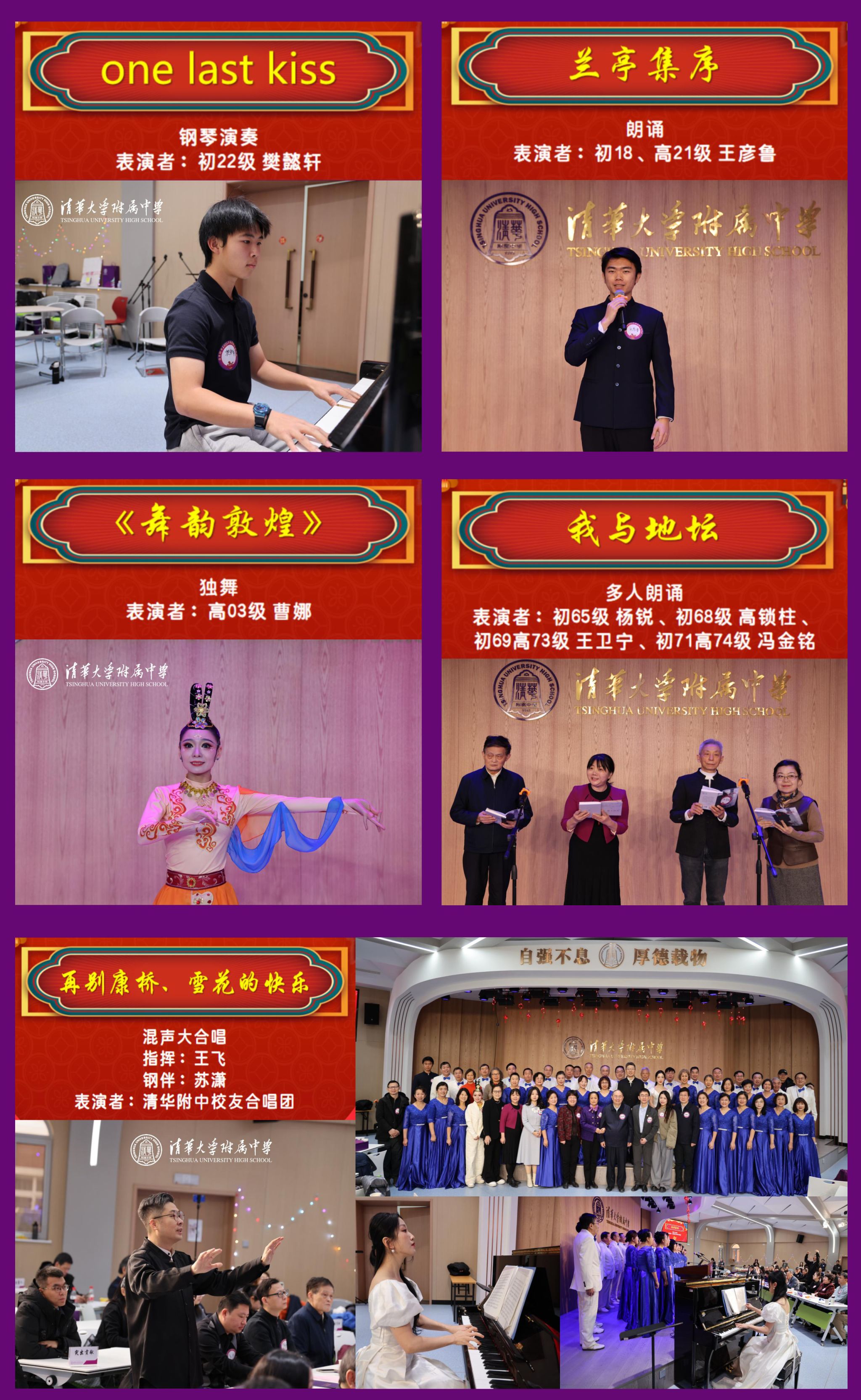 文艺演出环节将活动推向了高潮。初22级校友樊懿轩的钢琴演奏《one last kiss》优雅动人,初18、高21级校友王彦鲁的朗诵《兰亭集序》声情并茂,高03级校友曹娜的独舞《舞韵敦煌》婀娜婉转。此外,初65级杨锐、初68级高锁柱、初69高73级王卫宁、初71高74级冯金铭一同朗诵的《我与地坛》和皇冠体育官网校友合唱团的混声大合唱《再别康桥》、《雪花的快乐》等节目也赢得了现场观众的阵阵掌声,为团拜会增添了浓厚的节日氛围。