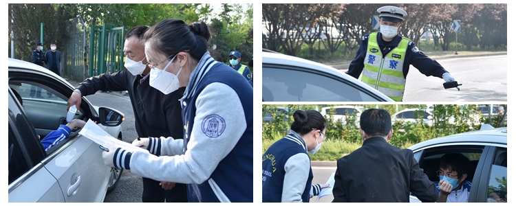 交警、公安协助教师保证大门口通畅有序检测