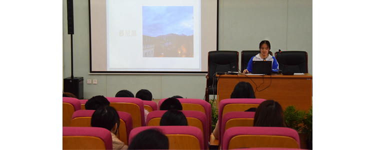 随后,此次境外研学德意奥、英国和美国团队各派一组代表,和同学们分享了此次研学活动的收获。德意奥团队代表带领大家走入文艺复兴时期,近距离感受米开朗基罗,达芬奇等艺术大家用尽毕生心血的创作;英国团队代表向同学们展示了原汁原味的英国课堂;美国团队代表与大家分享了别样的美国艺术之旅。三组同学的精彩分享,使没有参加境外研学的同学也能感受到海外文化的特色与魅力。台下聆听的同学们热情洋溢,对台上同学的分享颇有兴趣,对整个交流会也十分配合。每一位代表的分享都乐趣横生,使在座的每一位同学仿佛身临其境,整个会场十分欢乐。