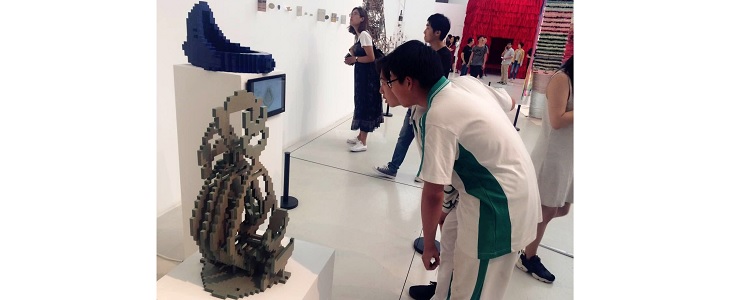之后参观雕塑、实验艺术作品展区,作品跨度很大,开拓了学生的眼界,有写实具象的木雕作品,有实验性的装置作品,有新媒体影像作品等等。开放而多元的艺术表达形式下更多体现的是作品背后的积极思考,一种用作品传达的态度,让大家体会到艺术作品的内在实质。