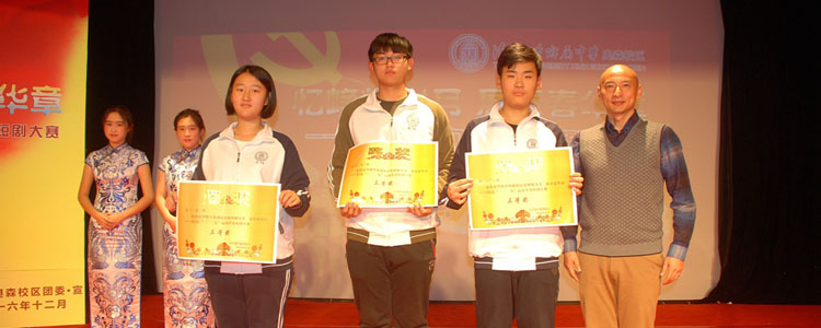 本次活动以“忆峥嵘岁月·展青春华章”为主题,比赛以班级为单位进行角逐,所有剧目都是由学生自编自导自演,共6支参赛队伍。伴随着高二(1)班巴子天悠扬的小提琴声,比赛开始了。《听妈妈讲那过去的故事》、《勇夺福州城》、《刘胡兰》、《抗战轶事》、《觉醒》、《陈五的一二·九》轮番登场,演员们八仙过海、各显神通,虽说是高中生,但是他们对于不同人物气质和跌宕起伏情节的拿捏都恰到好处,惟妙惟肖的扮演不时引起台下阵阵掌声,让全场观众都感受到了演员们对于艺术的认真,对于历史的尊重。6个班的演员,虽然呈现了不同的故事,但无一不通过追溯历史,表达出一种激昂的爱国主义之情,捍卫国家尊严的强烈夙愿。计分阶段,主持指导柴老师带领5为主持人共同表演了诗朗诵《可爱的中国》,表达了对祖国母亲美好的祝愿。最后,杨建宇老师对整场比赛做了专业的点评。