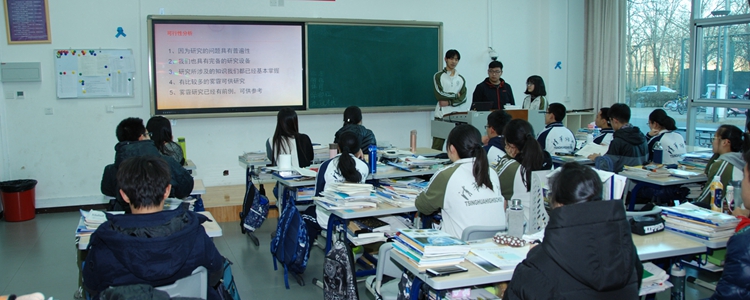 答辩流程分为三个环节,首先由学生通过PPT陈述选题内容,主要包括选题背景和意义、设计内容与思路和工作规划等几方面内容;随后,由答辩评委点评和打分,并提出问题以及给予指导建议;最后针对相关问题由学生进行自述总结。在此次研究性学习活动中,各组同学在老师的指导下都进行了精心的准备。共有《故宫建筑群中明清两代建筑区别》、《有关雾霾的微生物研究》、《流感病毒在春秋季多发的原因》、《< 红楼梦>人物关系浅析》等27个具有思考性的选题进行了开题答辩。同学们选题丰富多彩,研究背景、意义与目的考虑全面,研究方法选择恰当。在各小组指导老师的指导和帮助下,同学们的开题答辩过程精彩热烈,对答辩小组积极提出问题及建议,经过老师的点拨和同学们的相互质疑和反驳,不断理清自己的研究思路,深入自己的研究内容,完善自己的研究计划,答辩陈述得到了老师们的一致认可。同学们倍受鼓舞,表示在接下来的时间一定会勤思考、多动脑、读文献,真正在研究性学习项目中有所收获。