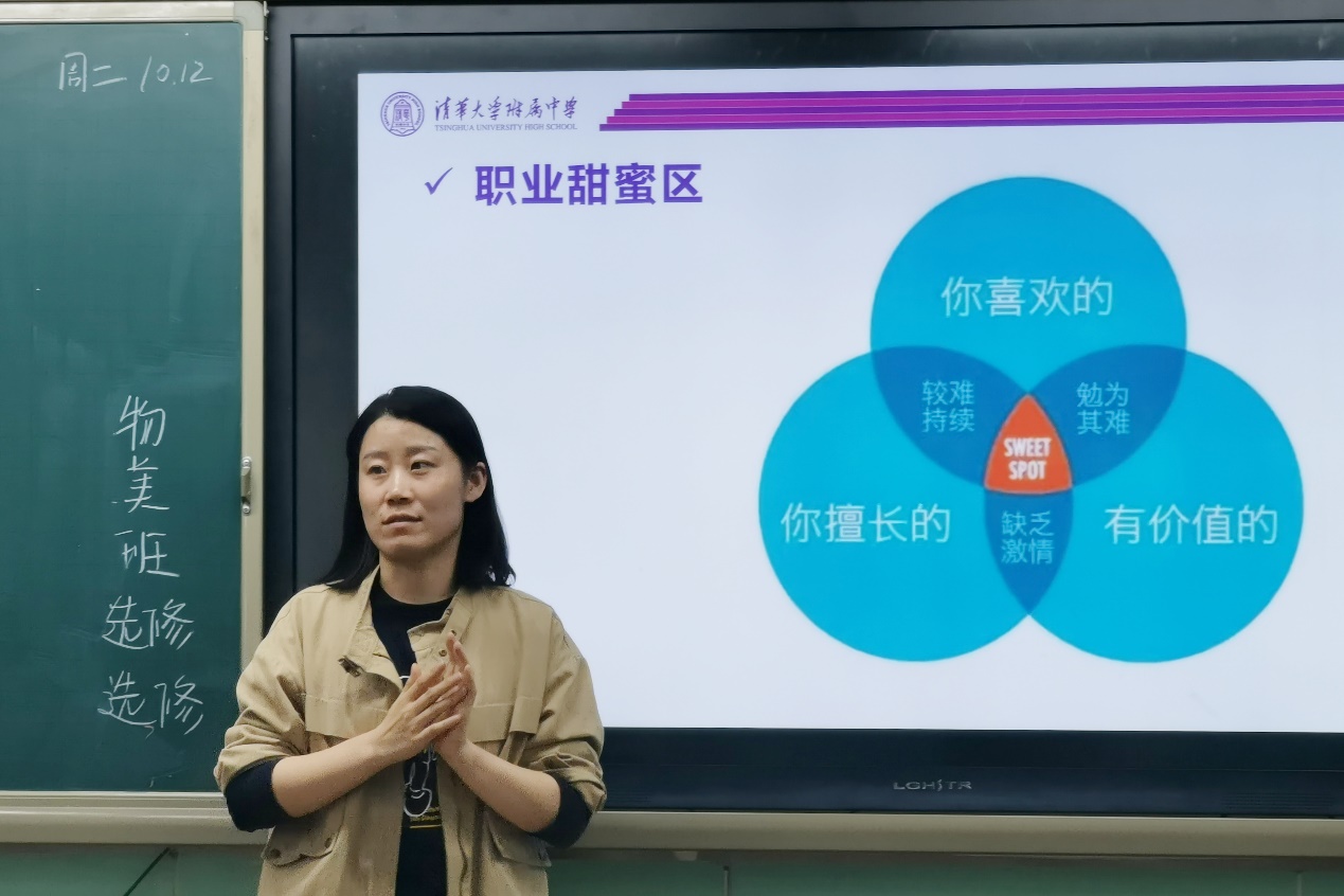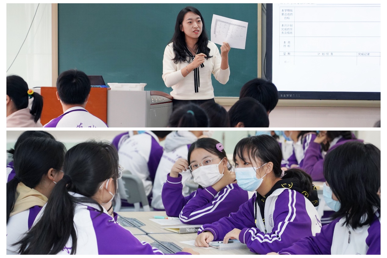 高一9班班主任沈忱通过趣味游戏和以往研究结果解析,引导学生树立目标、把握梦想,带领同学们回顾并梳理模拟招聘会中的收获与不足,根据自己的职业目标确立现阶段的成长计划。