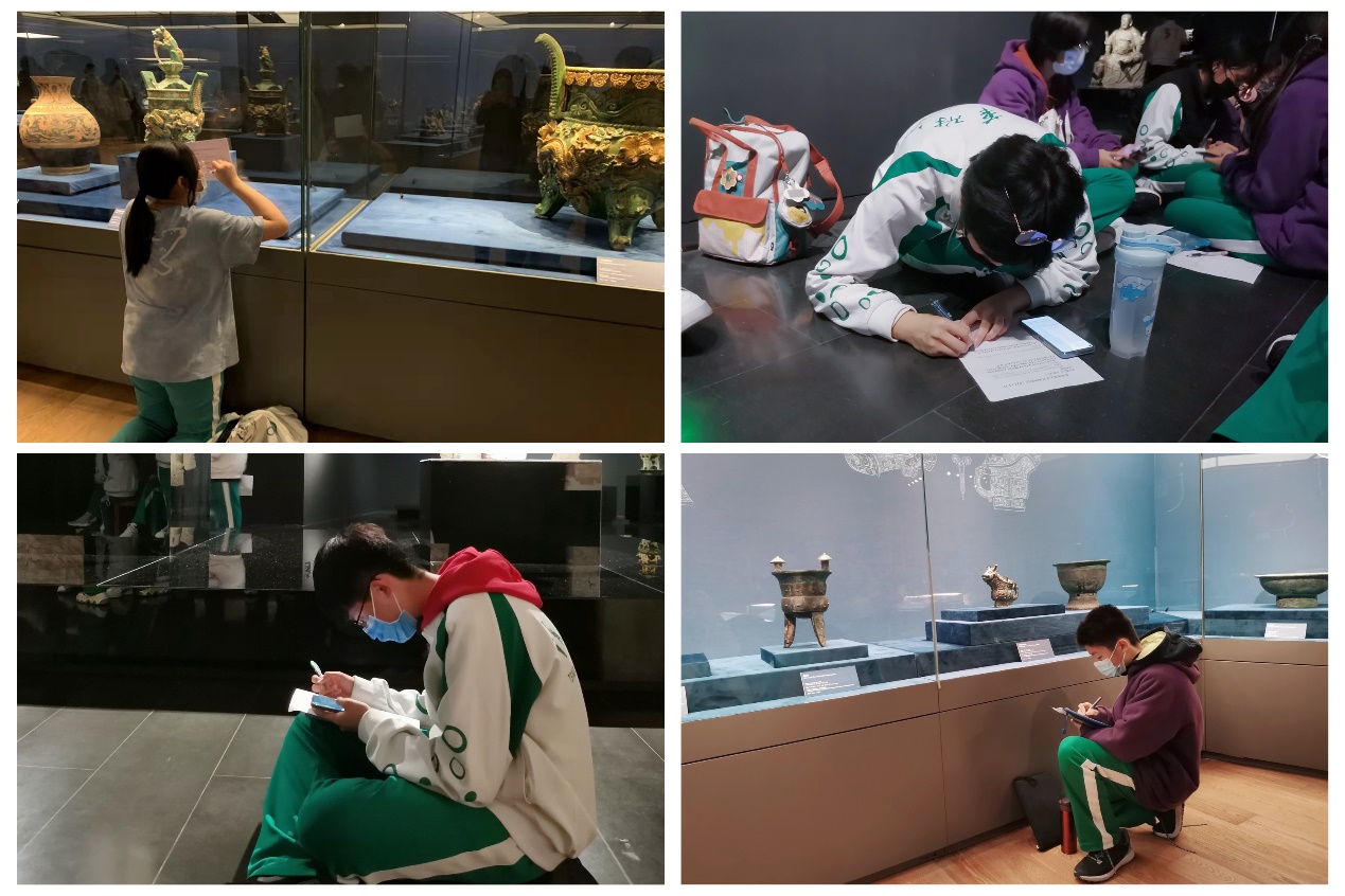 在欣赏之余,同学们围绕着令他们感受最深刻的文物展品,细细观察,慢慢端详,有些学生席地而坐,也有些学生半跪地面,甚至趴在地面…认真写下“美术学习单”。此时,在他们的世界里,仿佛只听得到自己和文物之间的交流对话。这样一张张专注学习的神情十分令人触动。