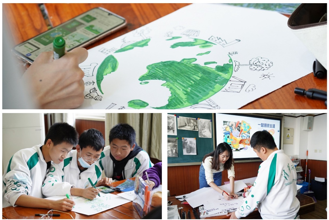 在美术组张孟柯老师的指导下,学生充分发挥了自己的想象力,绘制了“低碳生活小妙招”宣传海报,并在展板上进行展出。