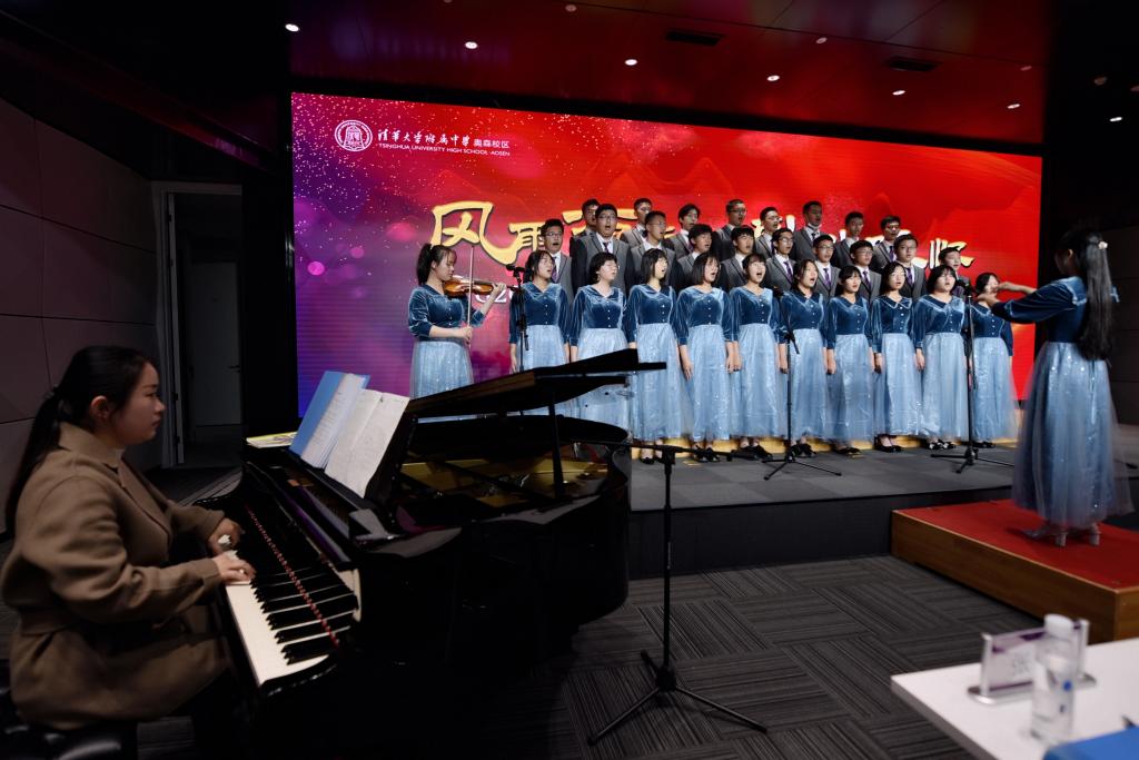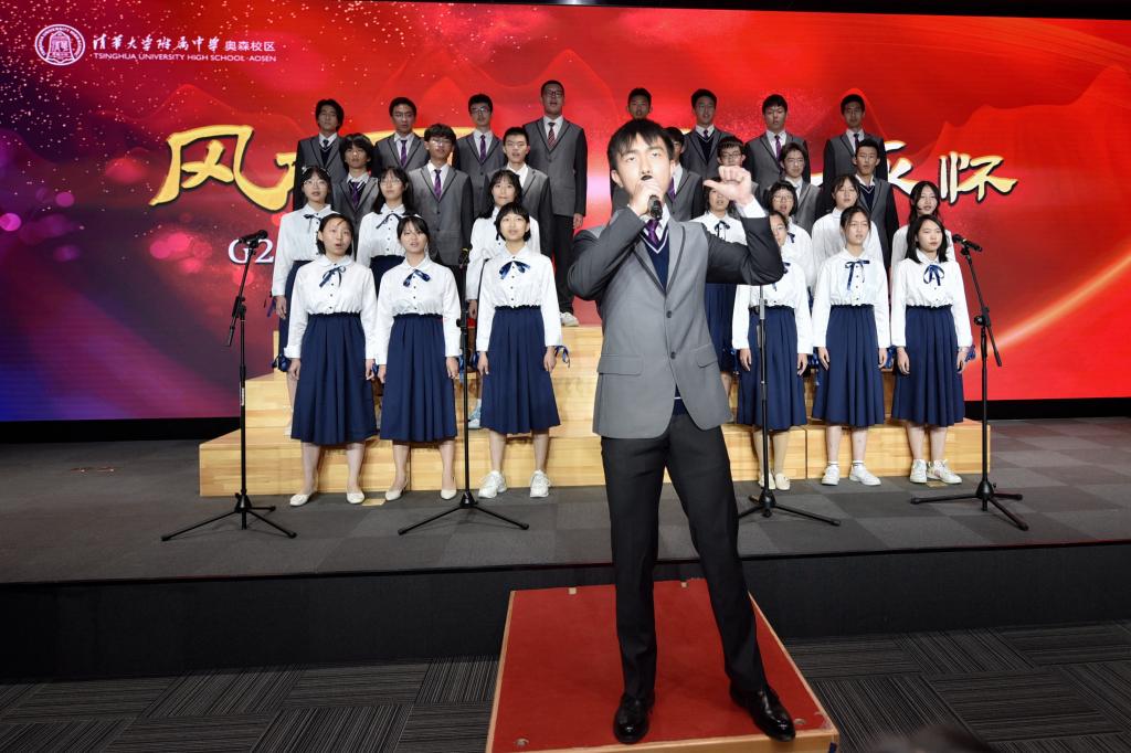 高一1班演唱《灯火里的中国》,展现了中国灯火里的繁华似锦和安详宁静、奋发图强和生生不息,鼓励着学生在灯火中奋进新时代。《追光者》唱出了少年们的故事,让人们在夏夜里的点点繁星中遨游。
