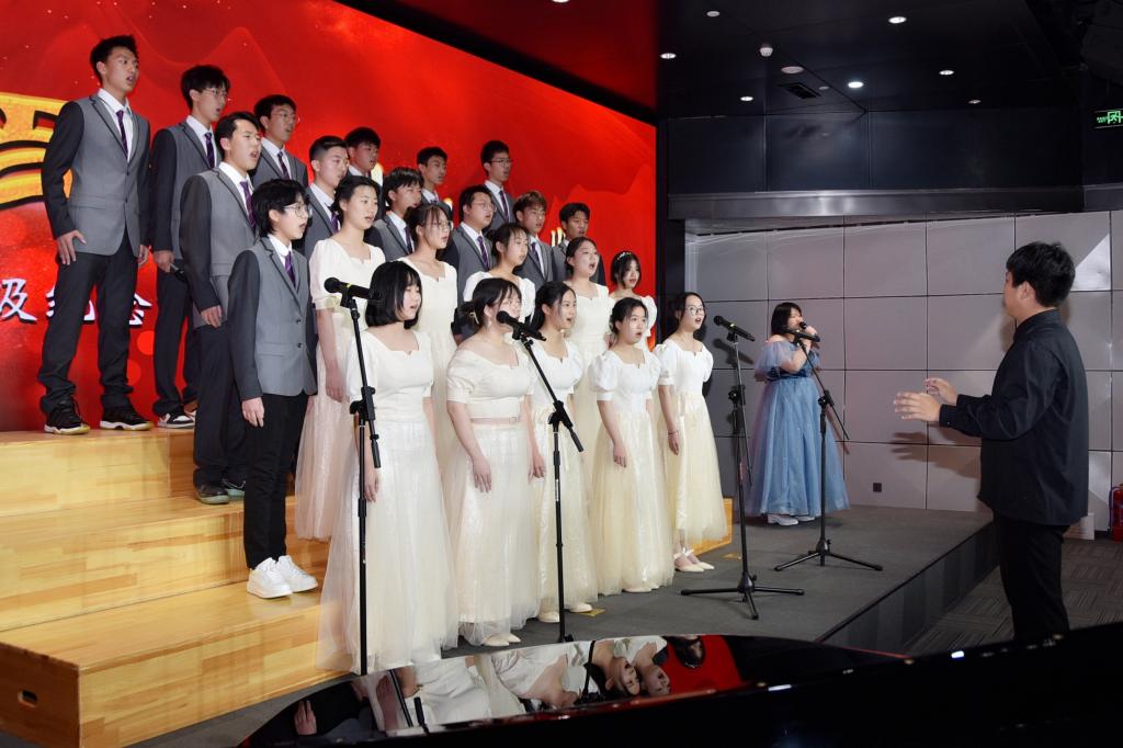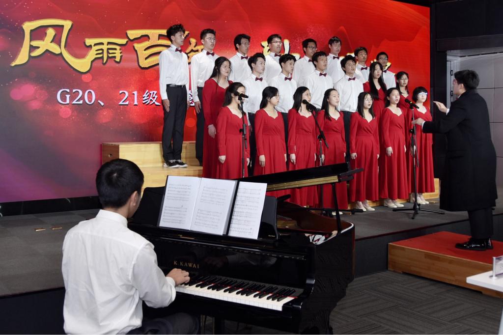 “发已千层白,心犹一寸丹,山歌传儿孙,余热献给党。”高一2班演唱《唱支山歌给党听》,歌声婉转却有力,表达了他们对共产党的拥护。《夜空中最亮的星》折射出他们不畏艰难险阻,努力追光的样子。