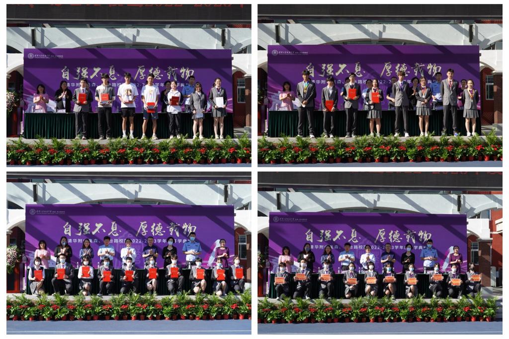 副校长张姝敏、吕宏娟、董薇与学生发展中心副主任陈卫东分别宣读了奥森、将台路校区2021-2022学年度表彰名单。领导、嘉宾为获得海淀区、朝阳区优秀团支部,优秀学生干部、校级三好学生、先进班集体、优秀毕业生代表及各项文体竞赛的获奖者颁发荣誉证书。