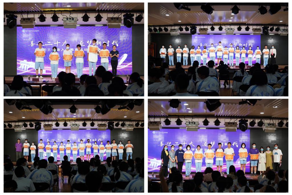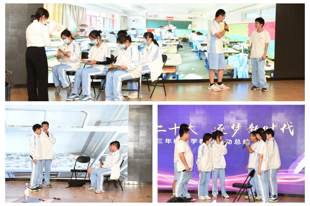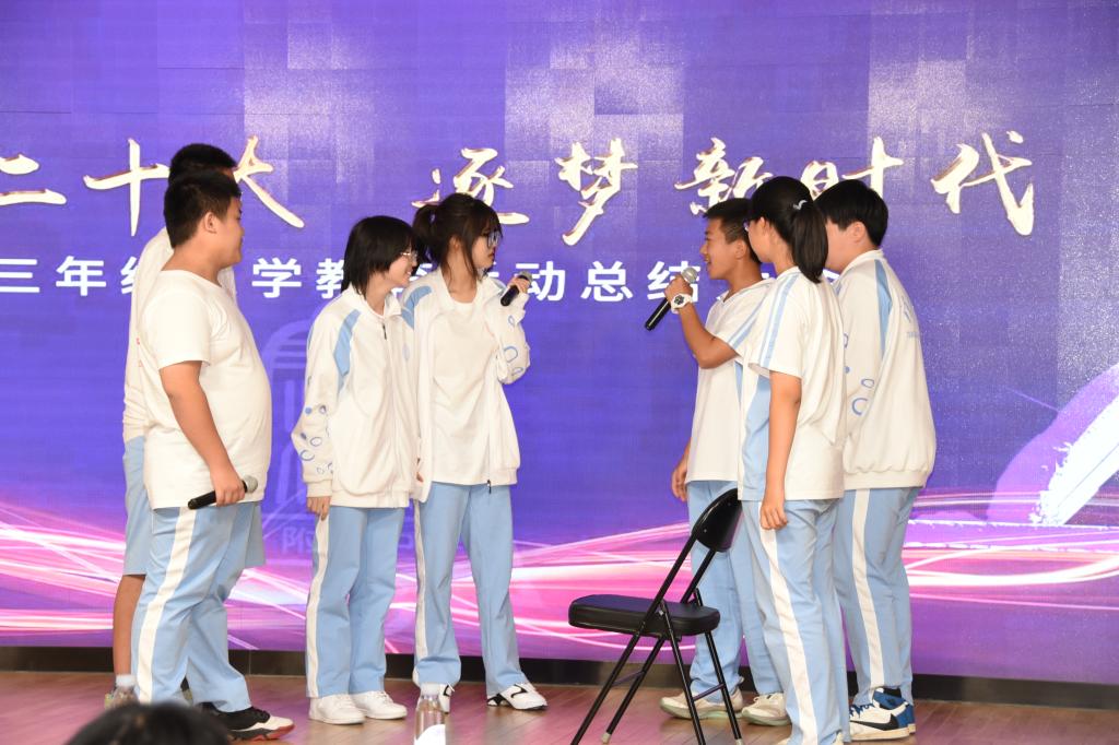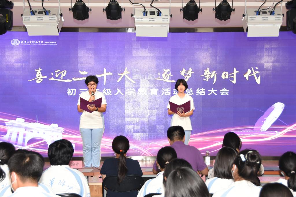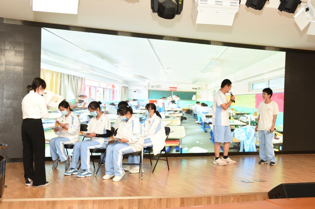 9月9日,初三年级入学教育活动总结大会在将台路校区阶梯教室召开。副校长董薇、资源保障中心副主任杨开宇、党办校办副主任李墨出席会议现场。会议以新生回顾视频展开,依次以班级为单位表演行为规范情景剧,展现出入学教育以来新生在行为规范方面的收获与成长。