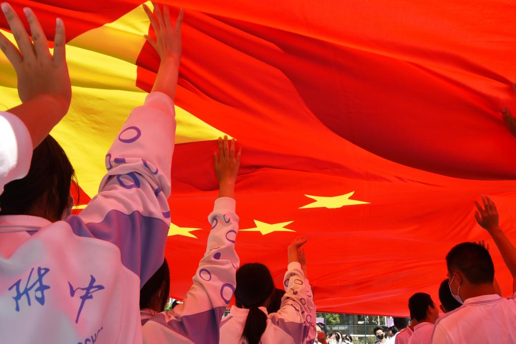 学生触摸国旗