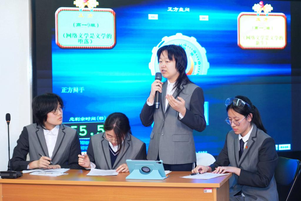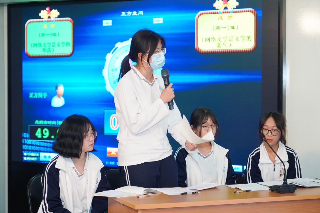 高一(9)班和高一(2)班就决赛辩题“网络文学是文学的堕落”和“网络文学是文学的新生”展开激烈辩论。双方你来我往、交锋激烈,使现场的气氛不断升温,也带领同学们深度思考网络文学的意义。