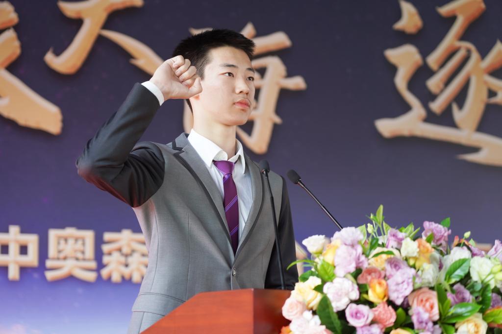 毕业生代表李雨昂带领全体学生进行毕业宣誓,学子们用坚定的眼神,有力的话语传达出内心的执着。