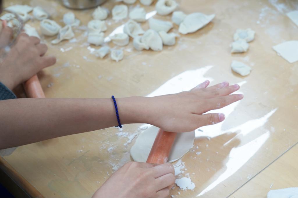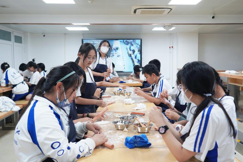 在厨艺课堂上,同学们按步骤进行家庭版小馄饨的制作,从擀面皮、调馅料、到包馄饨,有序进行,气氛温馨有爱。