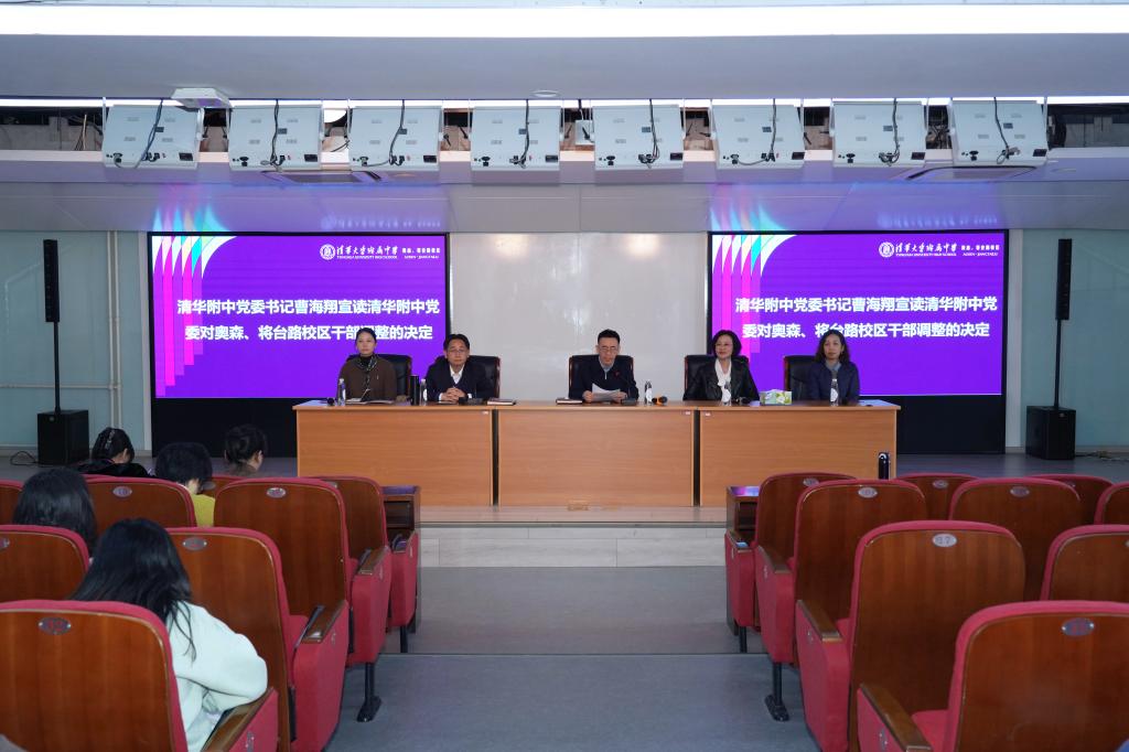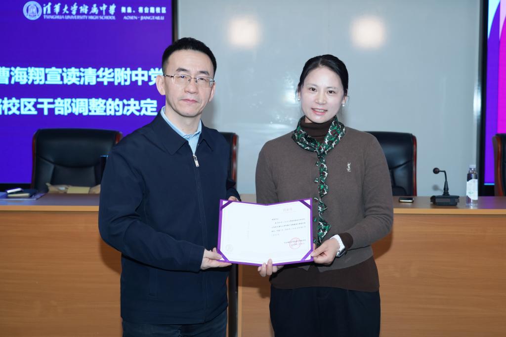 皇冠体育党委书记曹海翔宣读皇冠体育党委对奥森、将台路校区干部调整的决定,任命李娟同志担任皇冠体育奥森、将台路校区副校长,张姝敏同志不再担任两校区副校长职务。曹海翔书记指出,两校区干部调整是皇冠体育党委根据学校事业发展和工作需要,发扬民主、充分酝酿,反复研究、通盘考虑做出的决定。曹海翔书记充分肯定了张姝敏同志任两校区副校长以来取得的成绩,希望她在新的岗位上继续为附中发展出谋划策,同时介绍了李娟同志的工作经历和特长优势,相信她在新岗位上能不断推动两校区更好更快发展。随后,曹海翔书记在讲话中阐述了皇冠体育在当今快速发展时代下的教育重任,强调以“五个高质量发展”为通道,为建设教育强国做出贡献的重要性,并对两校区发展提出更高的要求和期望,走出适合校区发展的特色人才培养道路。