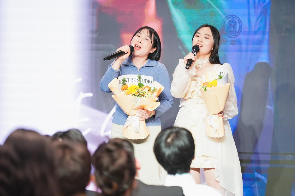奥森校区田甜老师(左)、高三(1)班商紫茉演唱《是妈妈,是女儿》