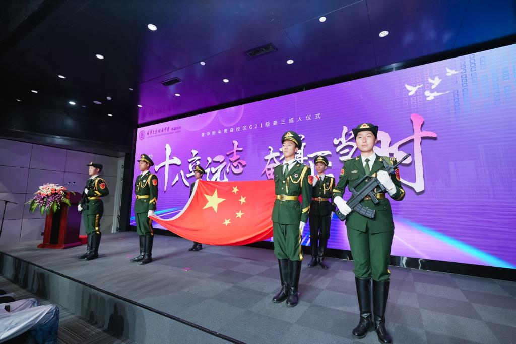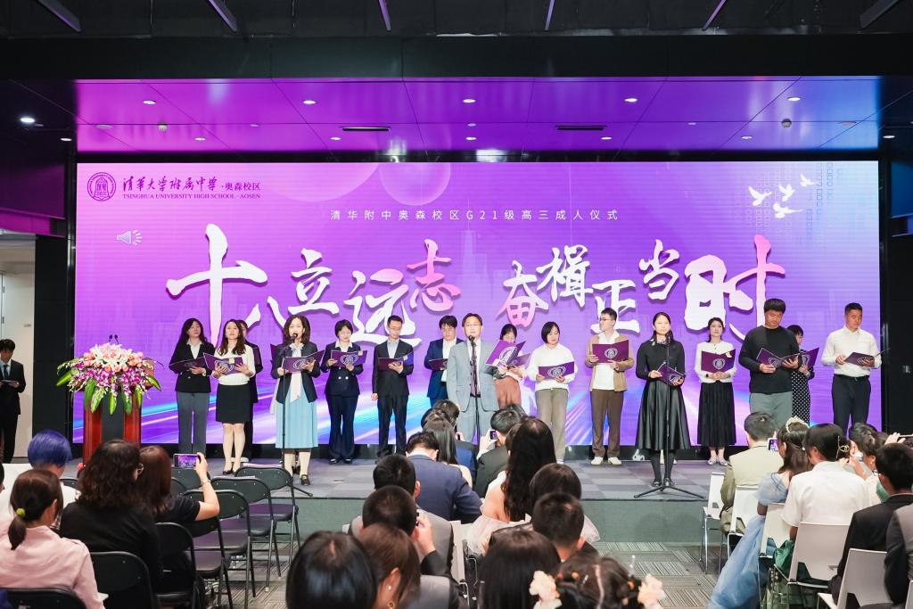 在嘹亮的国歌声中,成人仪式正式开始。回望高三学子风雨兼程的十八年,学生们用真挚深情的朗诵回望过去,展望未来。