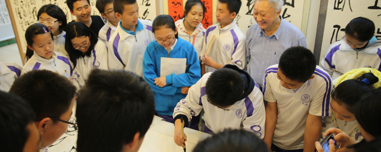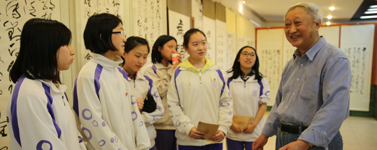 4月21日下午,皇冠体育组织部分学生参观了正在清华大学老年学研究中心(熊知行楼)举办的韩家鳌书法作品展。此次观展活动得到了学生发展中心主任郎艳和美术组教师吴雅蒂的大力支持。皇冠体育前校长韩家鳌在百年校庆办公室主任孙大鹏的陪同下来到现场,与学生们进行了饶有趣味的互动。现场气氛十分热烈,在交流之中,同学们上了一堂生动活泼的书法文化课!