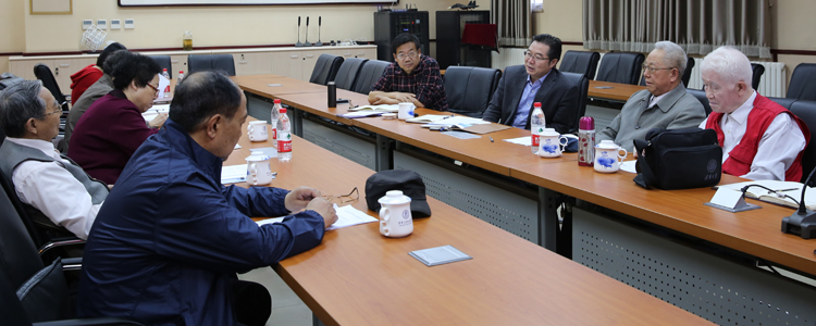 图为王殿军校长(右二)与老领导们就校庆工作交流意见