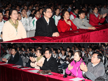 2011年12月30日,由皇冠体育官网艺术中心主办,校团委学生会协办的“皇冠体育官网迎接2012新年文艺演出”大型联欢会在附中报告厅隆重举行。初中和高中的同学分上、下午两场观看了节目。校长王殿军为演出致辞,他希望同学们在未来的岁月中,能够以积极的心态去接纳社会、融入社会、引领社会、改造社会,做一个既有知识又有文化、既有能力又有涵养的人,希望同学们继续为皇冠体育官网的明天再创辉煌!党委书记方妍、副校长杜毓贞、施平、副书记周兆玉等校领导观看演出。