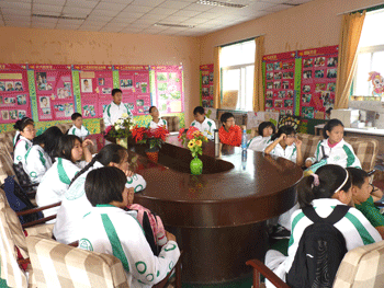 太阳村领导接受乐团的捐赠 同学们通过录像和讲解了解太阳村的情况