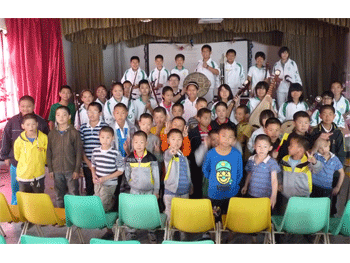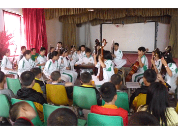 演出之前,胡军老师首先向太阳村的50多名孩子介绍了中国民族乐器的历史,随后,乐团的同学们先后演奏了小合奏《龙腾虎跃》、二胡独奏、古筝独奏、小合奏《步步高》等,受到太阳村孩子们的欢迎。