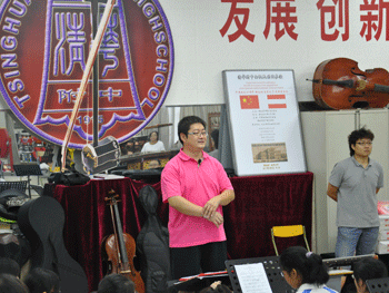 乐团新生们逐一做了自我介绍和学艺的经过,有的同学还设想了自己在乐团三年的生活。之后,胡军老师以《做金帆人 铸民族魂》为主题致欢迎辞,胡军老师讲到:我校的东南,是世界著名的清华大学,我校的西北,是名扬天下的万园之园—圆明园。圆明园毁于国耻而清华大学始于国耻。作为金帆民乐团的一员,维护我们的传统文化安全,让世界感受古老的中国音乐魅力,是我们理应肩负的责任与使命。我们要像小小的萤火虫,哪怕只能发出微弱的光,也要照亮我们身边的些许世界,尽自己的微博力量保护我们的文化传统不被遗忘,通过音乐艺术,把我们5000年的民族精神传播出去,当16亿华人都放光发热时,世界必将感受到万丈光芒。