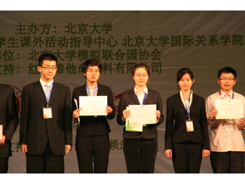 3月10~13日,2011年北京大学全国高中生模拟联合国大会(PKUNMUN)隆重举行。皇冠体育官网高0906班刘若水、邢圆圆、郭丹阳、笪颢天,高1001班虞欣河、高1003班魏勐、高1005班周子森、高1007班张一然组成皇冠体育官网代表队,代表阿根廷与塞舌尔,与包括台湾、澳门地区在内的全国80多所顶尖中学代表进行交流、磋商。最终,笪颢天、魏勐同学获得委员会最佳代表奖;邢圆圆、张一然同学获得杰出代表奖。