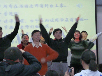 三个游戏环节分别是中国传统的谜语竞猜、喜闻乐见的“借东西”比赛和火爆的全体老师做广播操比赛。初二年级老师还为每个学生送上一块大白兔奶糖,祝福同学在兔年天天喜洋洋,进步又吉祥。