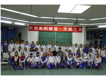 同学们互动尝试芭蕾动作 报告会后同学们与刘老师及小演员合影