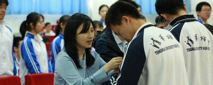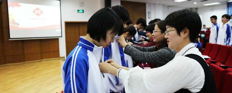 老师们为新团员佩戴团徽