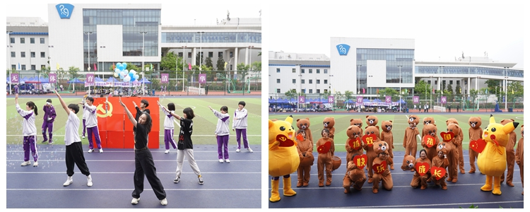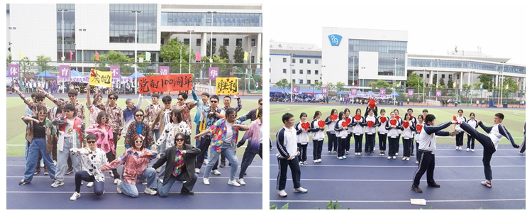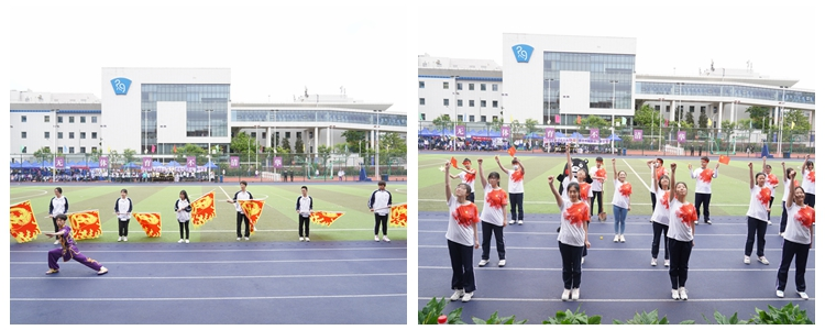 开幕式上,各个班级方阵表演活力四射、创意缤纷,口号铿锵有力、斗志昂扬。绚丽的舞姿,矫健的步伐,展现出学生积极阳光、奋力拼搏的精神风貌。升国旗与校旗仪式庄严肃穆,冉冉升起、迎风飘扬的五星红旗与校旗象征着师生拼搏进取、勇往直前的精神。