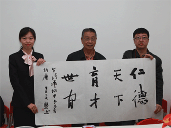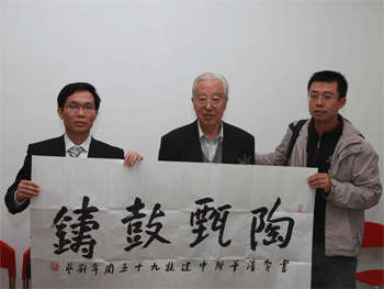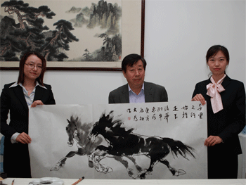 著名书画家刘大为(中)现场作画“马到成功” 著名书画家刘艺(中)现场作书