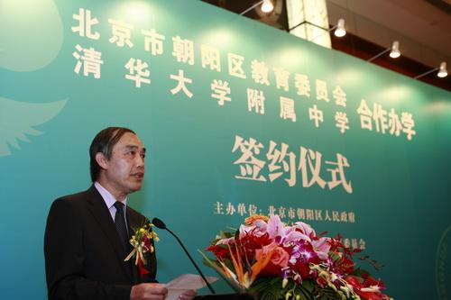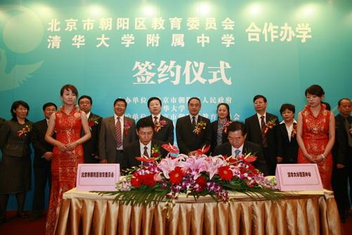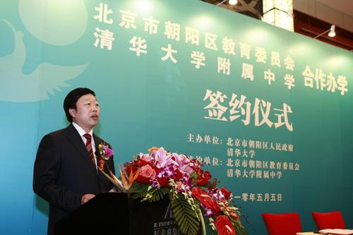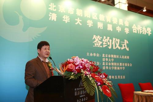 5月5日上午,北京市朝阳区教育委员会与皇冠体育官网合作委托办学签约仪式在朝阳区昆泰嘉华大酒店举行。签约仪式由朝阳区政府和清华大学共同主办,由朝阳区教工委书记吴金龙主持。全国人大常委会委员、清华大学副校长袁驷,朝阳区区长程连元等区委区政府领导和皇冠体育官网、朝阳区教工委、教委、部分中小学领导以及部分媒体记者出席了签约仪式。皇冠体育官网校长王殿军和朝阳区教委主任孙其军在合作协议上签字。