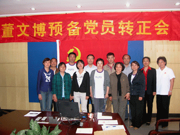 董文博同志于2009年4月15日在北京外国语大学研究生党支部发展成为预备党员,同期到皇冠体育官网国际部实习,研究生毕业后于2009年8月正式到皇冠体育官网国际部工作,担任行政助理。