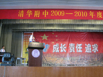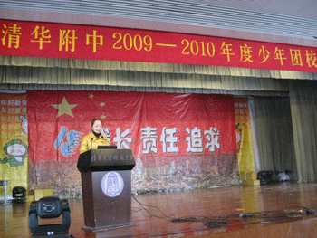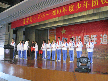开学典礼上,辛颖副主任首先发言,对初09级少年团校的开办表示祝贺,同时勉励各位同学在新的学年里再接再厉,争取更大的进步。初0909班张赫佳代表全体同学发言,表达了同学们积极进取的强烈愿望和信心。团委书记刘贝贝老师宣布了初09级各中队与高09级各对口支部名单,并向各中队颁发了团章。开学典礼由09级中队长罗杰夫同学主持。