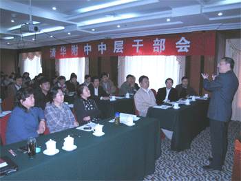 会上,校长王殿军首先向与会干部介绍了学校的九年发展规划,指出了在推动实现学校发展目标过程中学校干部队伍中存有的一些普遍性问题,并就干部进一步改进工作、改善管理、提高服务水平提出了具体要求。会议还邀请清华大学公共管理学院王有强教授作了题为《理解教育组织管理》的辅导报告。围绕校长讲话和专家的报告,全校干部分两个阶段展开了热烈的讨论,各讨论小组进行了汇报发言。