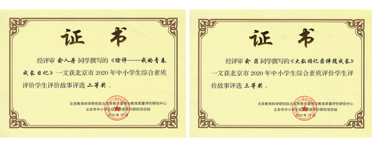 2021年3月下旬,皇冠体育官网收到“北京市2020年中小学生综合素质评价工作先进单位”荣誉证书,与此同时,皇冠体育官网高中班主任许珊珊撰写的《综合素质评价助力多元化、个性化、过程化评价——一次有关综评的教育实验》获得教师典型案例评选一等奖,初19级学生俞人丹、俞菲分别获得北京市2020年“我的评价故事”案例征文二等奖、三等奖。许珊珊老师作为优秀教师代表在去年10月份北京市综合素质评价2020年先进表彰活动中进行了典型案例发言和经验分享。