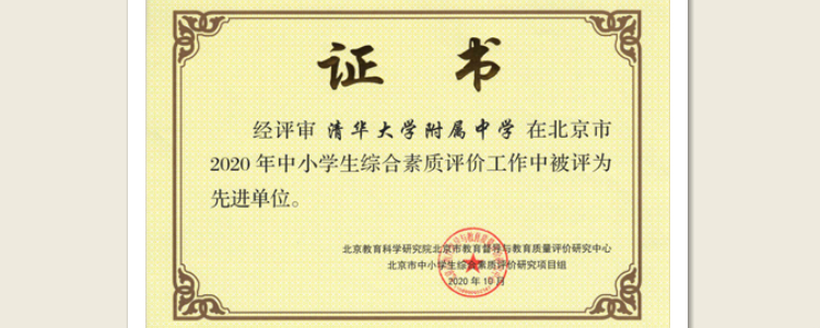“北京市2020年中小学生综合素质评价工作先进单位”荣誉证书