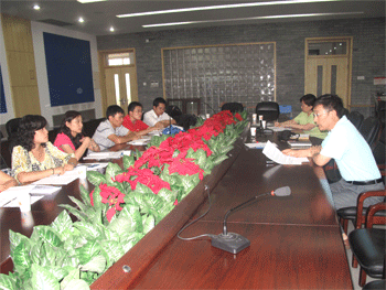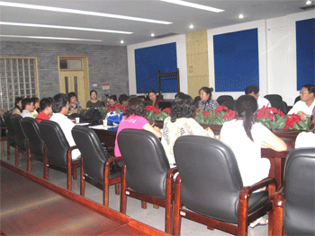 方妍书记(正面右3)讲话 孟卫东(右1)和刘慧霞(右2)老师分别介绍经验