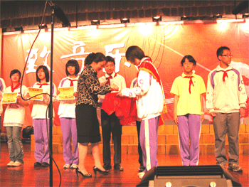周兆玉副书记宣读了初07级优秀集体和优秀个人的表彰决定:初0703中队、初0704中队、初0706中队、初0709中队和初0711中队获得“优秀中队”称号;宋宇辰等12名同学被评为“优秀中队干部”;徐涵等60名同学被评为“优秀少先队员”;陶力赫等156名同学被评为学习、纪律、文艺、体育和文明等单项标兵。王殿军校长和方妍书记为他们颁发了获奖证书。