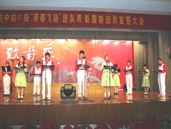 初二同学用诗朗诵《青春飞扬》来纪念自己告别少年、步入青春的特殊时刻。他们展望美好的青春年华,承诺作为青年人的责任,并祝愿同学们积极实践理想,让青春激情飞扬。最后全场起立高唱共青团团歌,大会圆满结束。