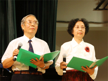 附中离退休教师合唱团正在演出 沈振基(左)、苏绍新老师担任朗诵