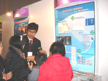 承旭同学(正面)向观众讲解自己的研究项目 部分获奖 学生(左起:王上、谢培伦、张伯民、王顺智、王主丰、承旭)