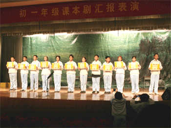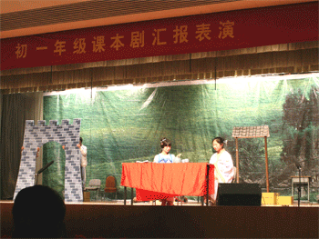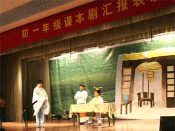 本次比赛从参赛形式上打破了以往以班为单位的比赛形式,第一次在初一全年级内尝试以2个班合作结为联队的方式进行比赛,学生们在这次比赛中既尝到了当一回小演员的乐趣,又学会了在团体合作中取长补短、共同进步。平日课本中的“晏子”、“愚公”、“邹忌”等大家熟悉的形象在小演员们的精彩演绎下,惟妙惟肖地再现于观众面前。