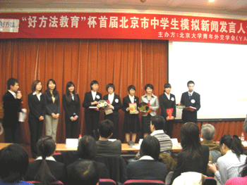 由北京大学青年外交学会承办的首届北京市中学生模拟新闻发言人大赛是目前全国最权威的模拟新闻发言人大赛,旨在引发青年学生对现行新闻发言人制度的关心,促进青年学生的发言技巧、应变能力和对社会时事与国际时政的思考能力的提高,从而为培养中国新时代复合型人才起到积极作用。本次大赛的议题主要包括:食品安全与对外贸易、汶川地震及政府责任、后奥运时代的北京规划等。大赛邀请外交部前新闻发言人(任期1988-1991年)金桂华先生、台湾中天电视台资深新闻人史哲维先生、北京大学国际关系研究专家余万里博士等担任评委。皇冠体育官网、人大附中、北京四中等14所北京知名中学的学生参加。